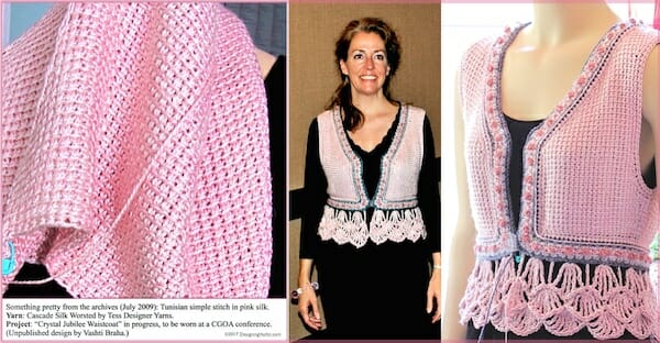 The pink silk vest pictured below features the same basic Tunisian Simple Stitch used for thick afghans for decades. I used a large hook size. There was no “Tunisian curl” (Tunisian crochet doesn’t lie flat when it’s crocheted tightly or with stiffer yarns).